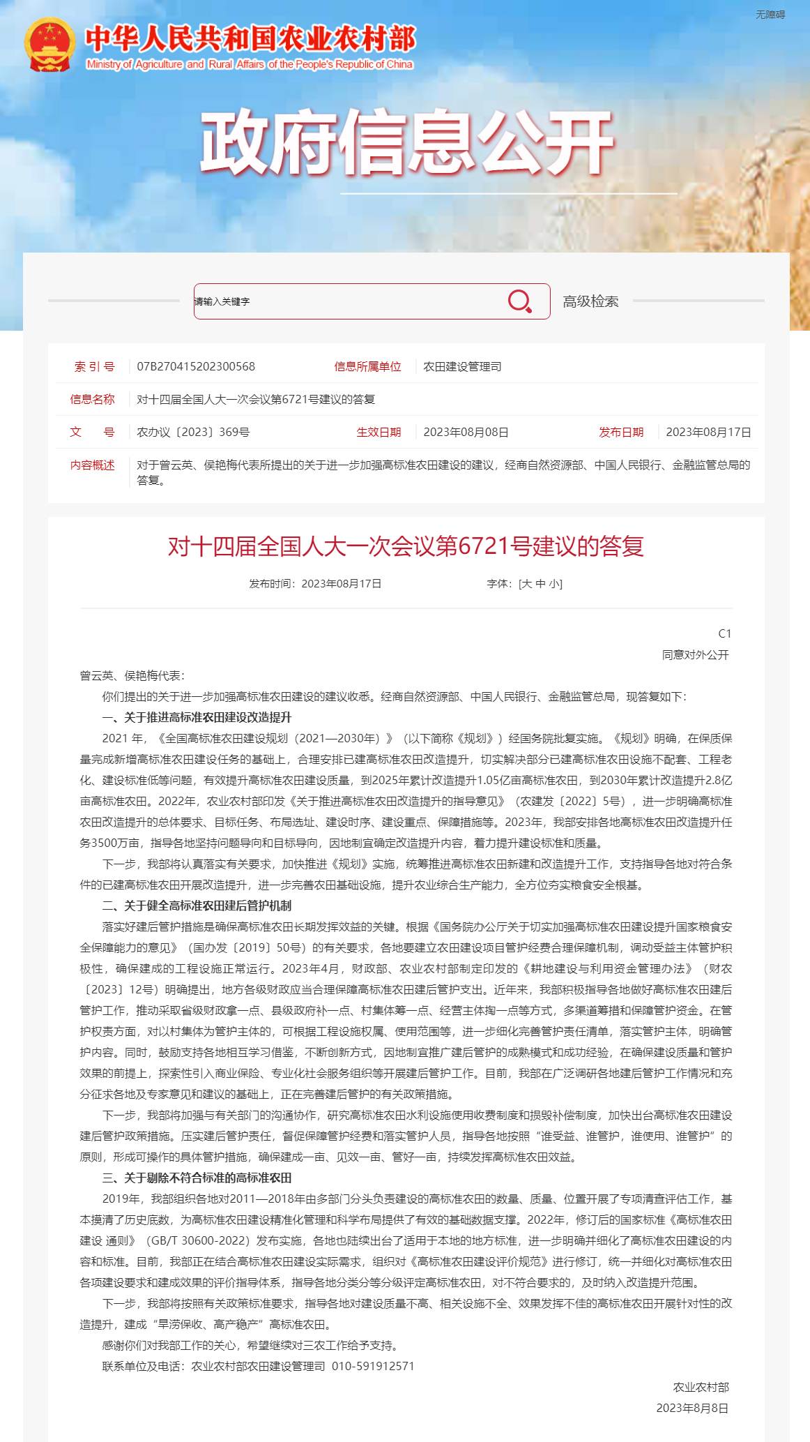 央視網(wǎng)消息:8月17日,農(nóng)業(yè)農(nóng)村部公布對十四屆全國人大一次會議第6721號建議的答復。其中提出,下一步,農(nóng)業(yè)農(nóng)村部將加強與有關(guān)部門的溝通協(xié)作,研究高標準農(nóng)田水利設(shè)施使用收費制度和損毀補償制度,加快出臺高標準農(nóng)田建設(shè)建后管護政策措施。壓實建后管護責任,督促保障管護經(jīng)費和落實管護人員,指導各地按照“誰受益、誰管護,誰使用、誰管護”的原則,形成可操作的具體管護措施,確保建成一畝、見效一畝、管好一畝,持續(xù)發(fā)揮高標準農(nóng)田效益。