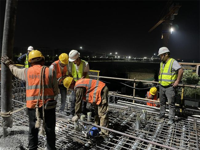 整個澆筑自10月15日下午4點44分開始,至10月16日早上7點30分結(jié)束,共用時14.77小時,本次澆筑采用泵送加下料管入模、附著式平板振動器加插入式振動器相結(jié)合的施工工藝,澆筑混凝土共計305方。此次澆筑為后續(xù)連續(xù)梁施工奠定了良好的基礎(chǔ),標(biāo)志著跨京滬高鐵立交特大橋施工正式進入控制性工程。