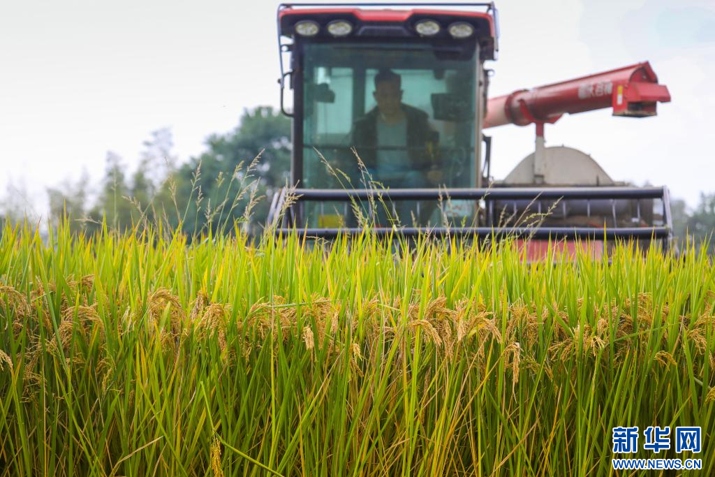 進(jìn)入豐收期,村民駕駛收割機收割水稻。