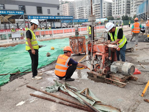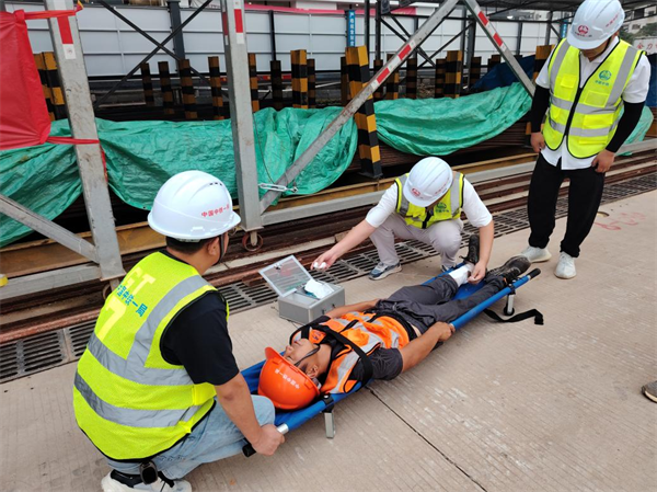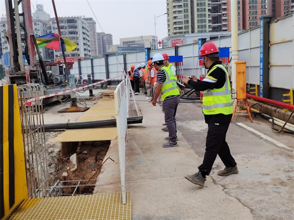 演練模擬項目車站在深基坑土方開挖過程中出現(xiàn)涌水涌泥緊急情況,接到“險情”匯報后,項目負責人歐瓊第一時間迅速啟動應急預案,立即組織疏散警戒組人員到達現(xiàn)場緊急疏散人群,做好警戒,確保搶險道路暢通。應急演練從發(fā)現(xiàn)險情、啟動應急預案、應急搶險到恢復正常生產(chǎn)秩序,時長近60分鐘,啟用各類車輛、機械10多輛(臺)。演練人員聞警而動,各個環(huán)節(jié)緊密銜接,各職能部門密切配合,處置得當,搶險反應迅速,在短時間內(nèi)完成了搶險救援工作,整個演練過程緊張有序,取得了良好的效果。