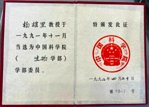 證書左側(cè)頁上寫著:“楊雄里教授于1991年11月當(dāng)選為中國科學(xué)院生物學(xué)部委員。”這里所說的學(xué)部委員就是現(xiàn)在我們熟知的中國科學(xué)院院士。