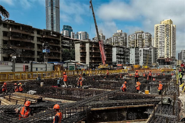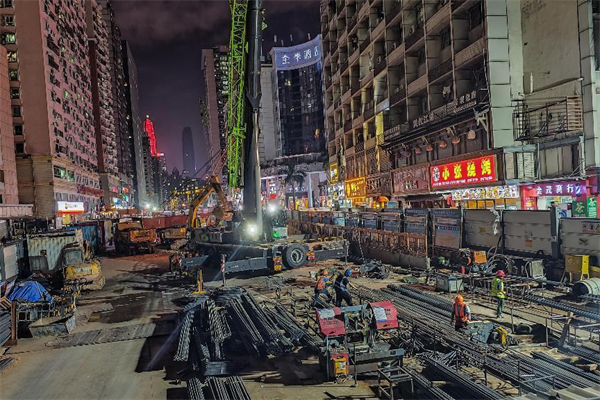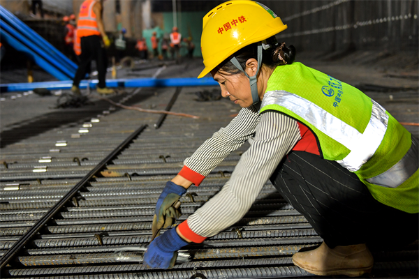 在1號工點的第3層基坑里,東邊,10幾名穿著印有工種名稱的反光馬甲的工人正忙著安裝模板鋼支撐;西邊,20幾名同樣穿著馬甲的工人,或綁扎鋼筋,或轉(zhuǎn)運鋼筋,或焊接鋼筋……一派忙而有序的大干場面。在3號工點地面,華燈初上,1臺吊車,4、5名鋼筋工、電焊工也在忙個不停……