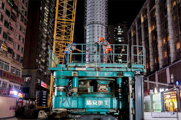 在鋼管立柱施工時,遇見一條10千伏電力管線,空隙僅僅只有10厘米;還有一道污水管距離50厘米。為保護(hù)好管線,施工時管理人員現(xiàn)場全程指揮協(xié)調(diào),防止異常情況出現(xiàn)以便能及時協(xié)調(diào)解決,使鉆孔設(shè)備在小心翼翼地轉(zhuǎn)動中安全順利完成了鋼管立柱插入施工。2022年10月10日,隨著最后一根26米長的鋼管立柱緩緩吊裝、精準(zhǔn)插入鉆孔中,中大八院站蓋挖鋼管立柱全部完成施工。至此,項目部高風(fēng)險大型起重吊裝施工全部完成、高噪音設(shè)備全部退場,中大八院站全面進(jìn)入深基坑開挖及主體施工階段。項目部經(jīng)受住了第二波考驗。