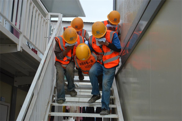 本次演練模擬施工現(xiàn)場電焊作業(yè)不慎點(diǎn)燃易燃材料擠塑板引發(fā)起火,引燃旁邊管理人員宿舍,導(dǎo)致一名人員疏散轉(zhuǎn)移不及時(shí)被困。演練現(xiàn)場設(shè)置了現(xiàn)場搶險(xiǎn)、醫(yī)療救護(hù)、技術(shù)保障、物資設(shè)備保障、安全警戒、后勤保障6個(gè)應(yīng)急小組。隨著總指揮一聲令下,演練人員立即組織人員緊急疏散,對(duì)被圍困的二樓作業(yè)人員進(jìn)行救援,同時(shí)組織人員進(jìn)行滅火,參演人員按照既定路線有序逃生,安全到達(dá)指定地點(diǎn)。同時(shí)邀請(qǐng)消防支隊(duì)講解常用的消防器材及滅火設(shè)施。
