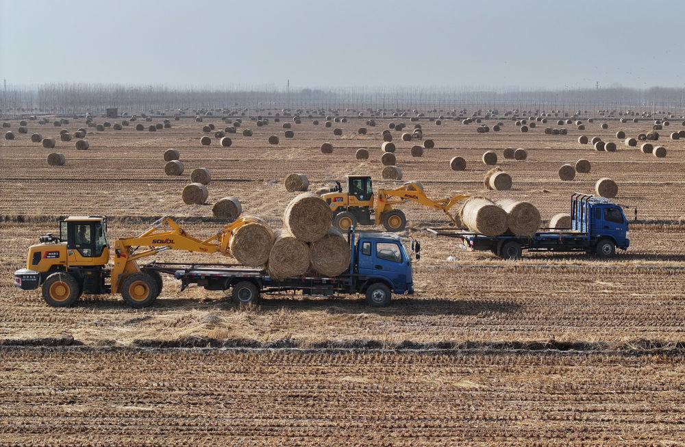 ↑河北省唐山市曹妃甸區(qū)第八農場田間,稻草回收企業(yè)的工人將打好捆的稻草裝車(無人機照片,12月10日攝)。曹妃甸區(qū)通過將稻草集中收集用于生物質發(fā)電、牲畜飼料和有機肥生產,有效提高了秸稈綜合利用率。