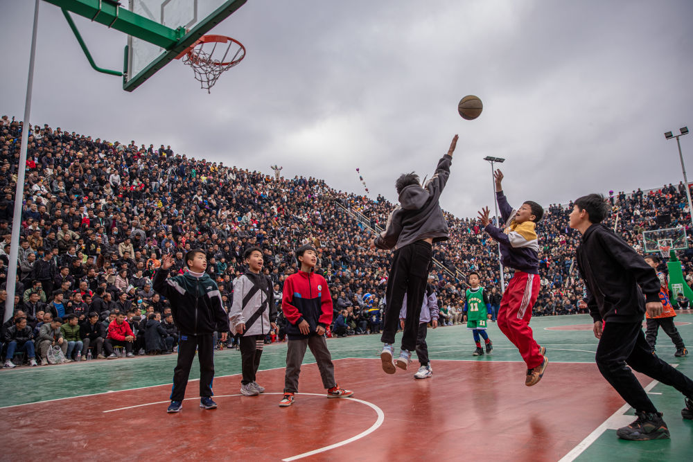 ↑貴州省黔東南州臺江縣臺盤村的小朋友在比賽前打籃球(3月25日攝)。當日,貴州省首屆“美麗鄉(xiāng)村”籃球聯賽總決賽在臺盤村開打。