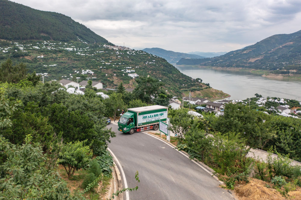 ↑重慶市巫山縣曲尺鄉(xiāng)柑園村,裝載有巫山脆李的中國郵政物流車行駛在村內(無人機照片,6月28日攝)。過去因為物流不便,經過幾天的運輸后,脆李的品質和口感會受到影響。現在,航空快遞的開通,讓巫山脆李快速走向全國。