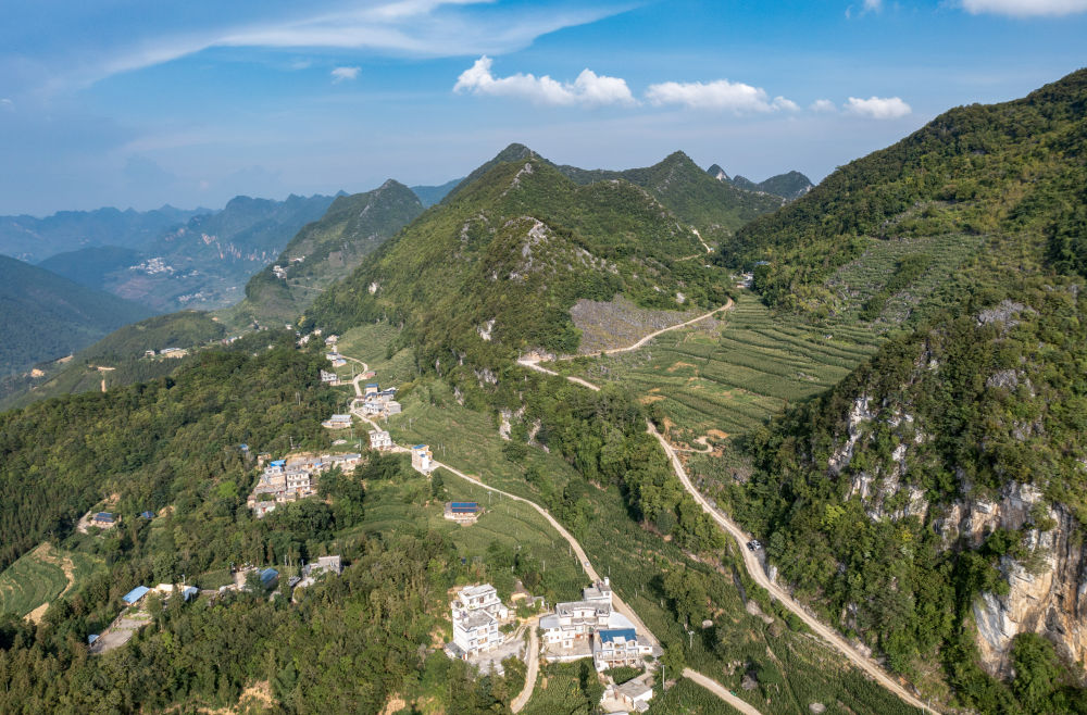 ↑云南省文山壯族苗族自治州西疇縣山間公路,右側這條是巖頭村村民小組長李華明帶領群眾修建的最后一公里進村道路(無人機照片,7月26日攝)。