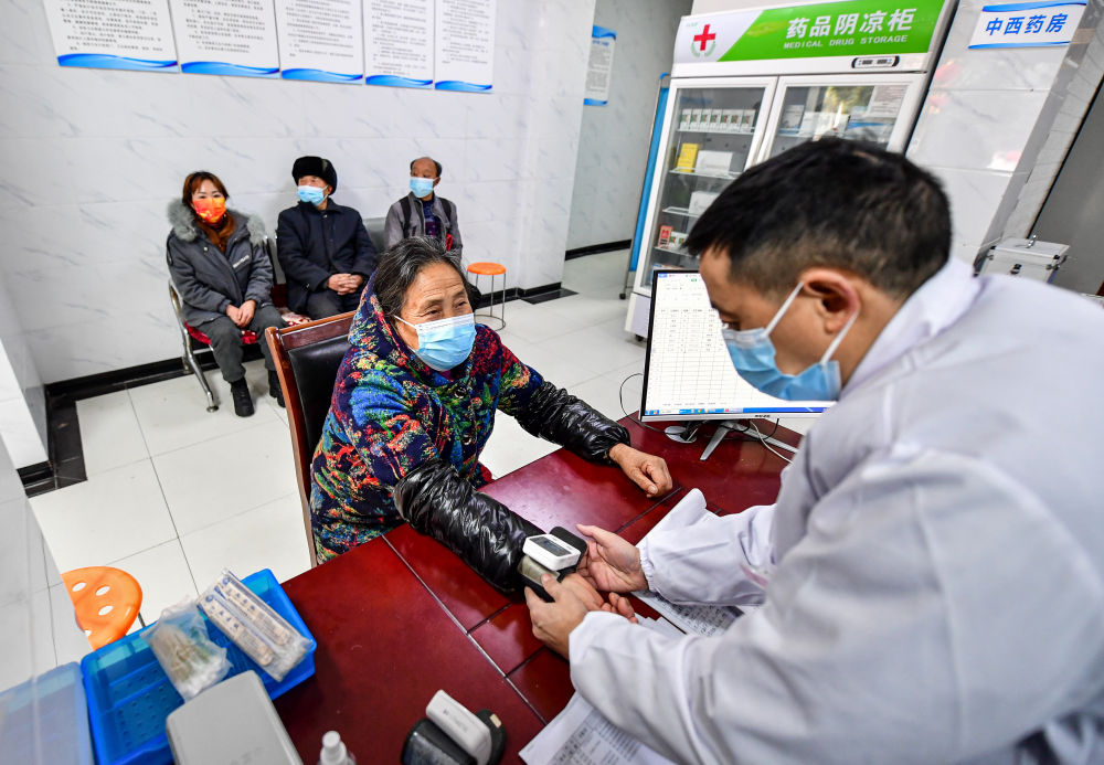 ↑四川省綿陽市北川縣曲山鎮(zhèn)任家坪村、石椅村聯合衛(wèi)生室村醫(yī)趙太安(右一)在村衛(wèi)生室為前來問診的村民測量血壓(1月19日攝)。