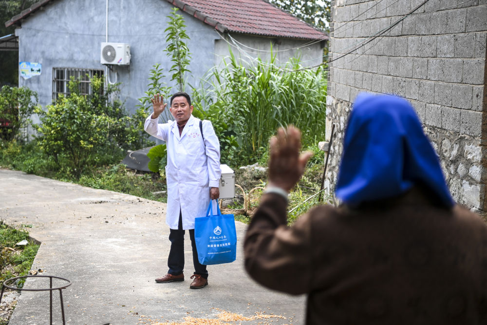 ↑廣西貴港市港北區(qū)大圩鎮(zhèn)中西村,村醫(yī)黃增亮(左)出診結束后與村民揮手告別(11月29日攝)。