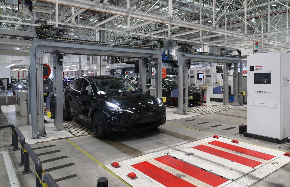 12月22日,在特斯拉上海超級工廠內,一輛特斯拉電動汽車在進行出廠前的車載電子設備檢測。新華社記者方喆 攝