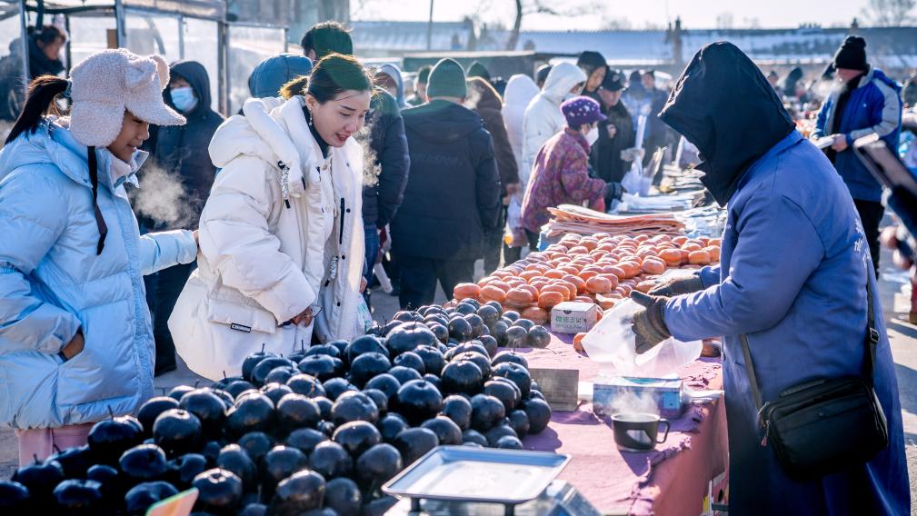 “凍梨凍柿子嘞,嘎嘎甜,不甜不要錢”“冰糖心蘋果賤賣嘍,3斤10塊”“排骨18塊1斤,棒骨8塊1斤”……臨近年關(guān),吉林省長春市近郊的卡倫大集上,人群摩肩接踵,叫賣聲此起彼伏。這個中國東北農(nóng)村集市年味漸濃。