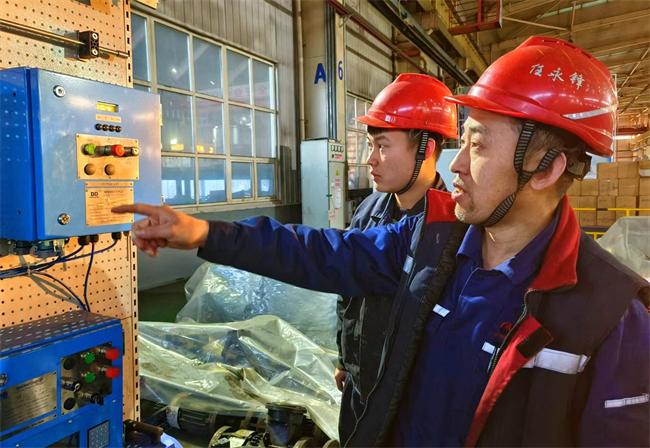 除夕一大早,姜肖航就跟著師傅任永峰在車間內檢修設備。