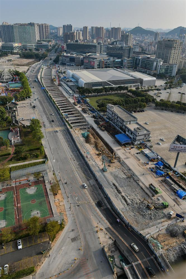 虎門大道站是東莞市地鐵2號(hào)線三期工程的第2個(gè)車站,為地下二層單柱雙跨箱型結(jié)構(gòu)島式車站。車站主體結(jié)構(gòu)長(zhǎng)496米,標(biāo)準(zhǔn)段寬20.9米,端頭段寬約28米,基坑深約19米,面積約21408平方米;附屬設(shè)7個(gè)出入口、4組風(fēng)亭,均為單層結(jié)構(gòu),基坑深約10至12米,面積約6490平方米。全站采用明挖法施工。