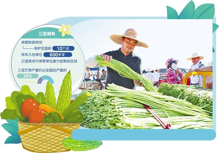 三亞蔬果業(yè)繁榮有賴于南繁種業(yè)基地的賦能。三亞擁有南繁科研用地保護(hù)區(qū)面積10萬(wàn)畝,常年入駐單位達(dá)600多家,已逐漸成為南繁單位最為密集的區(qū)域。每年冬春,來(lái)自全國(guó)各大農(nóng)業(yè)科研機(jī)構(gòu)的6000名專家人才匯聚于此,田地間、實(shí)驗(yàn)室、人才小院處處可見他們的身影,培育出最適合生長(zhǎng)在三亞市崖州區(qū)這片土地上的“致富苗”。