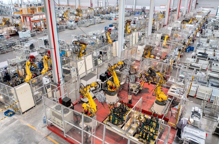 2024年1月8日,在位于浙江省湖州市長興經(jīng)濟技術(shù)開發(fā)區(qū)的長興地通汽車部件有限公司,全自動機器人高速運轉(zhuǎn)生產(chǎn)新能源汽車配件訂單產(chǎn)品(無人機照片)。新華社發(fā)(譚云俸攝)