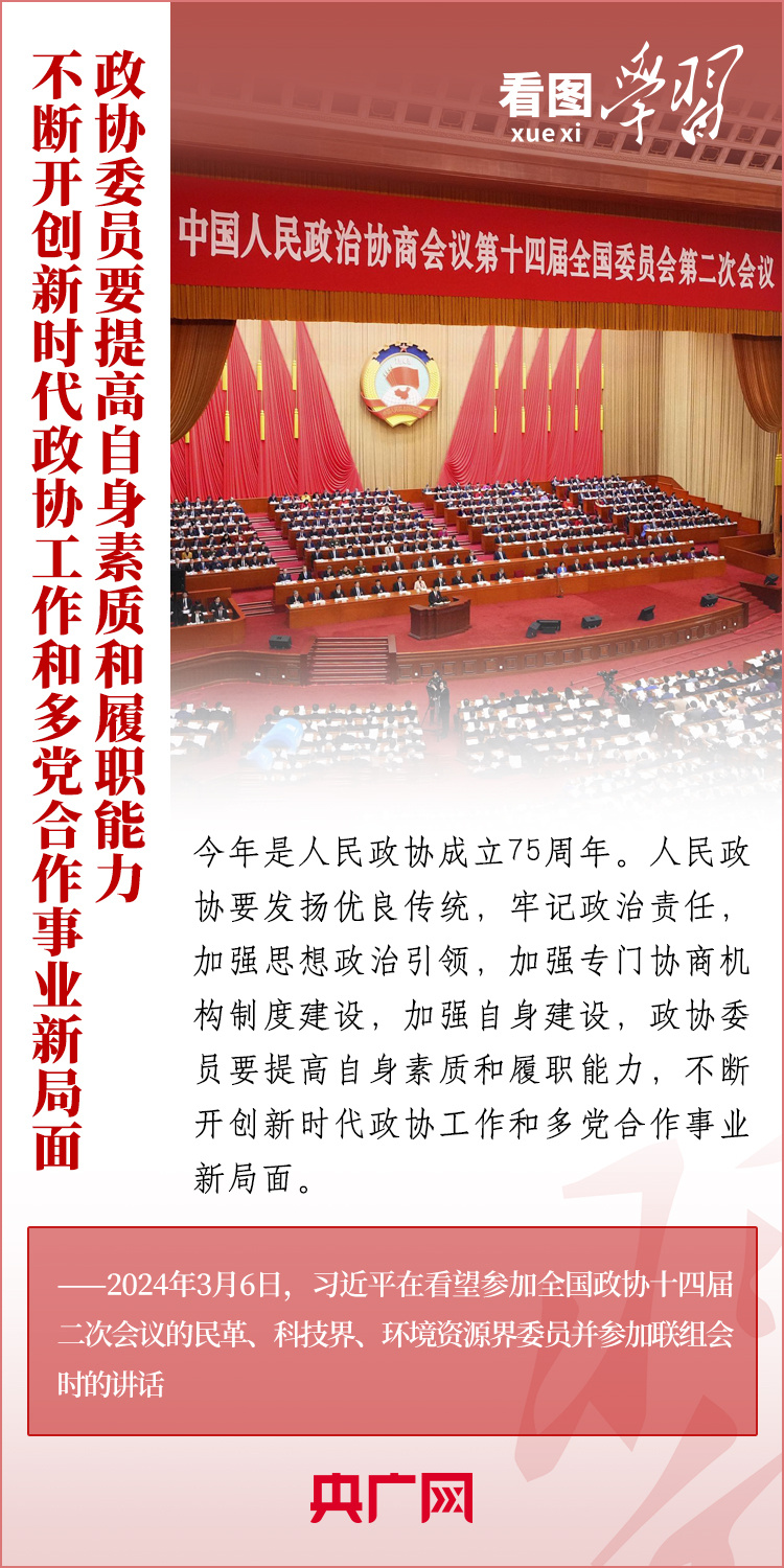今年是人民政協(xié)成立75周年。3月6日下午,習(xí)近平總書(shū)記在看望參加全國(guó)政協(xié)十四屆二次會(huì)議的民革、科技界、環(huán)境資源界委員并參加聯(lián)組會(huì)時(shí)強(qiáng)調(diào),人民政協(xié)各黨派、各團(tuán)體、各族各界各方面人士要圍繞中共二十大提出的重大戰(zhàn)略任務(wù)和中央經(jīng)濟(jì)工作會(huì)議部署,深入調(diào)查研究,積極建言資政,廣泛凝聚共識(shí),助力中國(guó)式現(xiàn)代化建設(shè)。一起來(lái)學(xué)習(xí)!