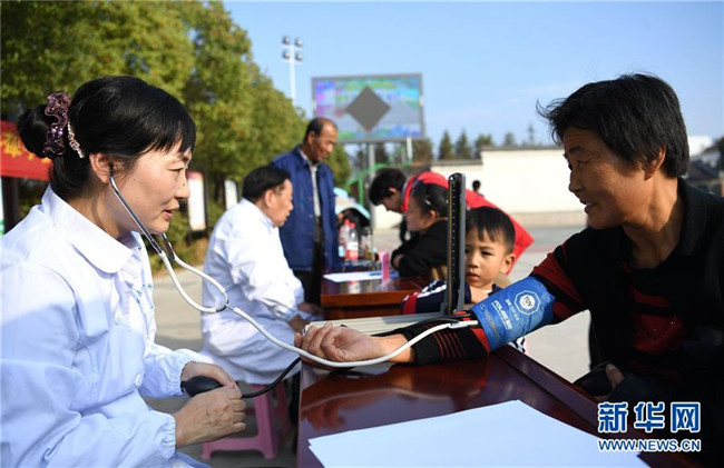 11月4日,安徽醫(yī)科大學(xué)第一附屬醫(yī)院的醫(yī)生為村民體檢。 當日,安徽省肥西縣豐樂鎮(zhèn)邀請安徽醫(yī)科大學(xué)第一附屬醫(yī)院的醫(yī)生來到鄉(xiāng)村,免費為周邊村民提供醫(yī)療咨詢、健康體檢、醫(yī)療保健等衛(wèi)生服務(wù)。新華社記者劉軍喜攝 11月4日,安徽醫(yī)科大學(xué)第一附屬醫(yī)院的醫(yī)生為村……