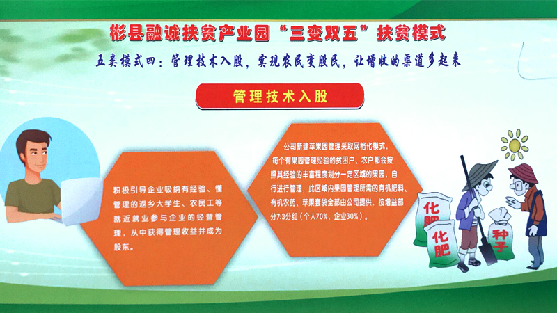 彬州融誠(chéng)集團(tuán)公司按照“企業(yè)主導(dǎo)、政府搭臺(tái)、群眾參與、社會(huì)共建”的思路,圍繞主導(dǎo)產(chǎn)業(yè),緊盯市場(chǎng)需求和脫貧政策動(dòng)向, 在外出考察學(xué)習(xí)的基礎(chǔ)上,借鑒貴州省六盤水市“三變”改革的成功經(jīng)驗(yàn),以“資源變資產(chǎn)、資金變股金、農(nóng)民變股東”三變改革為基礎(chǔ), 探索總結(jié)出了符合融誠(chéng)實(shí)際的“三變雙五”新模式。